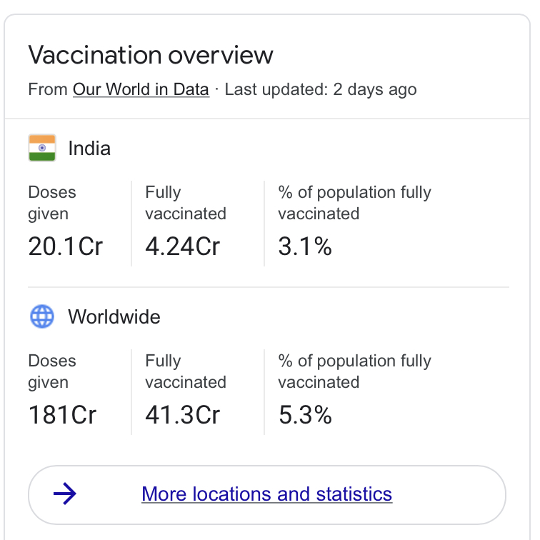 The peak at least in official numbers for the 2nd Covid-19 wave seems to have passed now in India, with daily caseload reduced to nearly ½ of what it used to be at the peak a few weeks ago. The public attention had started shifting from delinquencies in the cure (Oxygen, beds, ventilator, meds and medical staff) to deficiencies in prevention (vaccine). The number one conversation currently running on the minds of people is vaccines or lack of it. People have understood, by and large, that there is no alternative to getting inoculated when it comes to meeting the challenge that the virus and its many variants in circulation pose. PM Modi’s preoccupation with elections, disdain for the advice of the scientific community, contempt for knowledge and ill-informed bravado came in the way of his administration procuring the number of doses needed to protect the Indian people. As a result, India is experiencing a vaccine drought, of sorts. The mammoth gap between supply and demand, as can be seen in the attached numbers which are a testimony to dwindling rate of vaccination in India.